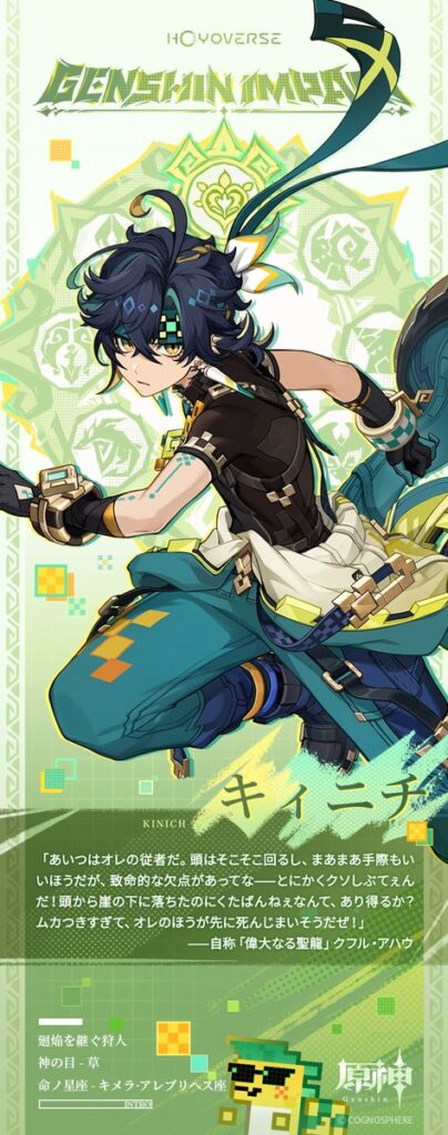 - キィニチ(草) ナタのフックショット使いです。戦闘外での探索の楽しさと、単体への火力が凄まじいキャラクターです。ナタ環境の開拓には欠かせません。